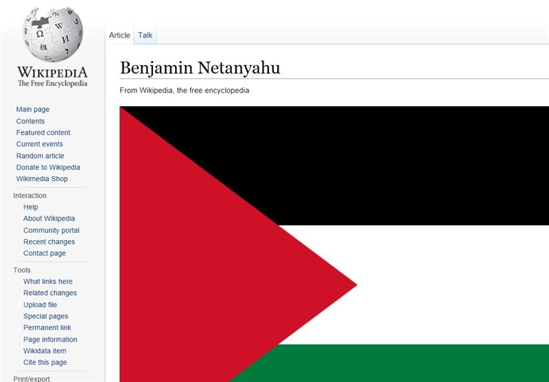 به گزارش گروه بینالملل خبرگزاری تسنیم، سحرگاه روز چهارشنبه پرچم فلسطین جایگزین صفحه بنیامین نتانیاهو، نخست وزیر رژیم صهیونیستی در دانشنامه اینترنتی ویکیپدیا شد. احتمال میرود فعالان اینترنتی وبسایت این دانشنامه را در اعتراض به تجاوز رژیم صهیونیستی به نوار غزه که بیش از دو هفته از آن میگذرد حک کرده باشند.
