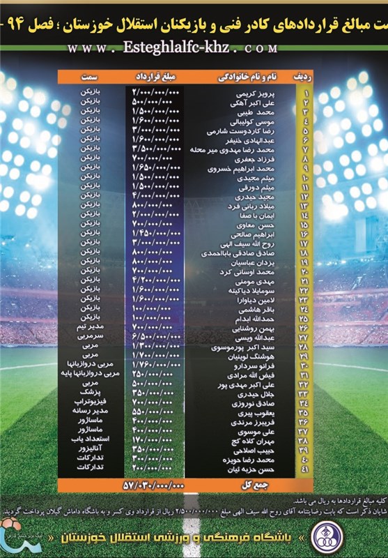 با توجه به تاکید سازمان لیگ برتر و به منظور شفاف سازی و اطلاع عموم مردم فهیم و ورزش دوست کشور عزیزمان ایران و زدودن جو شایعات پیرامون انعقاد قراردادهای نجومی، بدین وسیله باشگاه فرهنگی و ورزشی استقلال خوزستان به عنوان یکی از پیشگامان شفاف سازی و حمایت از این حرکت ارزشمند، اقدام به انتشار لیست مبالغ کادر فنی و بازیکنان خود به شرح ذیل میکند: