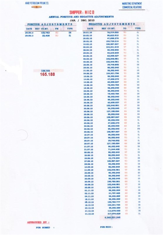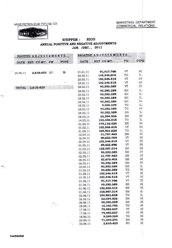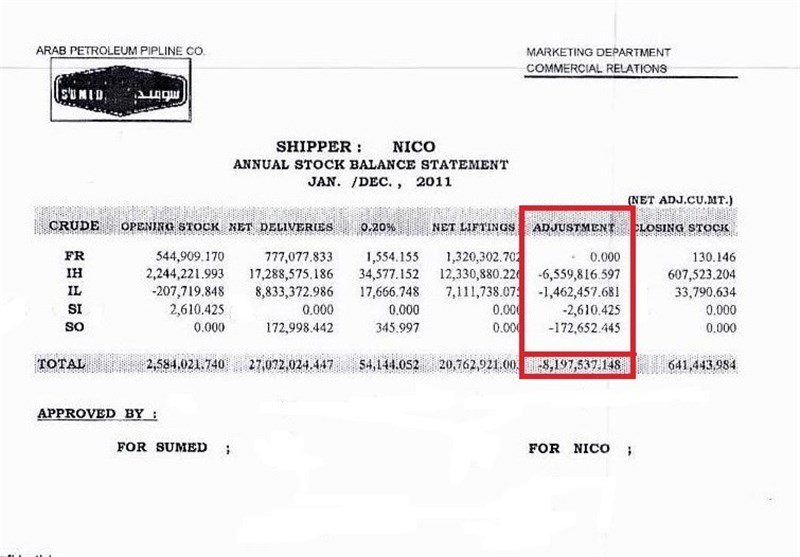 اگرچه عملیات حمل، انتقال و ذخیرهسازی نفتخام در خارج کشور توسط شرکت نیکو با هزینههای بالا صورت میگیرد اما آنچه که هدف این گزارش است اسنادی است که نشان میدهد میلیونها بشکه نفت خام ایران بدون دلیل مشخصی کسر شده است. در واقع شرکت عربی سومد علاوه بر کسر دو دهم درصدی از نفت انتقال داده شده از خطوط لوله مورد نظر که مورد پذیرش دو طرف قرارداد است، طبق ستون تنظیمات (ADJUSTMENT)، مقدار قابل توجهی از نفت ذخیره شده ایران را بر اساس تنظیماتی خلاف قوانین بین المللی به نفع خود کسر کرده است.