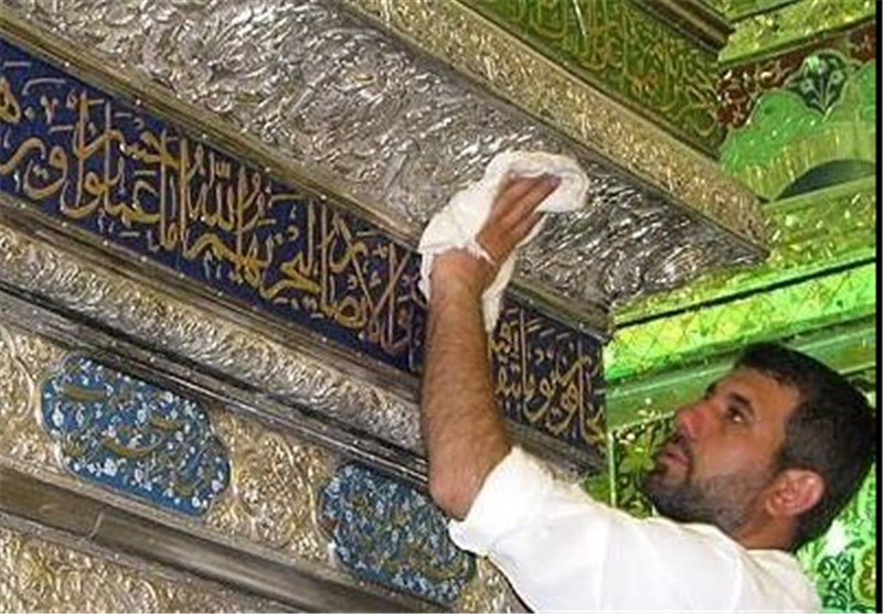 خبرنگاران قمی ضریح کریمه اهل بیت (س) را غبارروبی می‌کنند