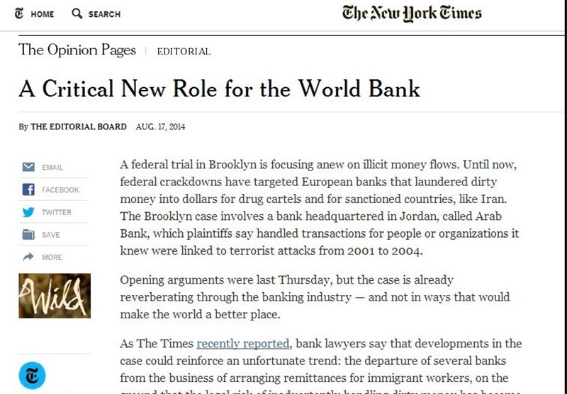 سرمقاله امروز نیویورک تایمز به مساله ای بانکی پرداخته که یک سر آن به تحریم و سر دیگر آن به مساله مهاجرت ربط پیدا می کند. تاکنون دادگاه ها در آمریکا به پرونده هایی در مورد پول شویی برای کارتل های مواد مخدر یا کشورهای تحت تحریم توسط بانک های اروپایی می پرداختند. اما این بار یک دادگاه فدرال در بروکلین نیویورک در حال برگزاری جلسات دادگاه پیراموان مساله پول شویی و انتقال غیرقانونی پول توسط بانکی به نام عرب بانک است که دفتر مرکزی آن در اردن قرار دارد. این پرونده موجب شده که صنعت بانکی از هم اکنون تحت تاثیر منفی آن قرار گیرد و انتقال پول توسط مهاجرین به کشورهای مبدا را تحت الشعاع قرار دهد. چرا که ریسک انتقال پول های کثیف متعاقب رویدادهای جدید بسیار بالا رفته و بانک ها ترجیح می دهند تا کلا قید چنین کسب و کارهایی را بزنند. این مساله سال ها تلاش بانک جهانی برای تسهیل انتقال میلیاردها دلار دستمزد کارگران مهاجر به خانواده هایشان در کشورهای فقیر را با چالش مواجه کرده است. حال برای بانک جهانی بسیار حیاتی است تا اقدامی کند و مانع وقوع چنین کاری شود.