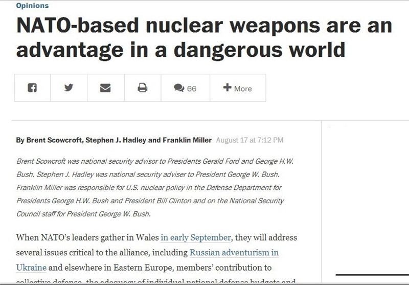 در این مطلب آمده است: قرار است تا در اوایل سپتامبر رهبران کشورهای عضو ناتو در ویلز دور یکدیگر جمع شوند تا در رابطه با چند مساله حساس مشورت نمایند: ماجراجویی های روسیه در اوکراین و شرق اروپا، سهم اعضا در دفاع جمعی، کفایت بودجه نظامی هر یک از کشورهای عضو و طراح ها برای پشتیبانی از مردم افغانستان. در کنار این مباحث، باید درباره ارزش وجود شماری از تسلیحات اتمی آمریکا در اروپا تاکید شود.
