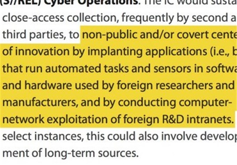 برخی از برنامهریزیهای مطرح شده در این سند مربوط به برتری آمریکا در عرصه خارجی در عرصه «پایش» (SURVEILLANCE) مربوط میشود اما برخی دیگر به وضوح به استفاده از جاسوسیهای سایبری برای تقویت مزیت رقابتی شرکتهای آمریکایی در مصاف با شرکتهای خارجی مربوط میشوند.