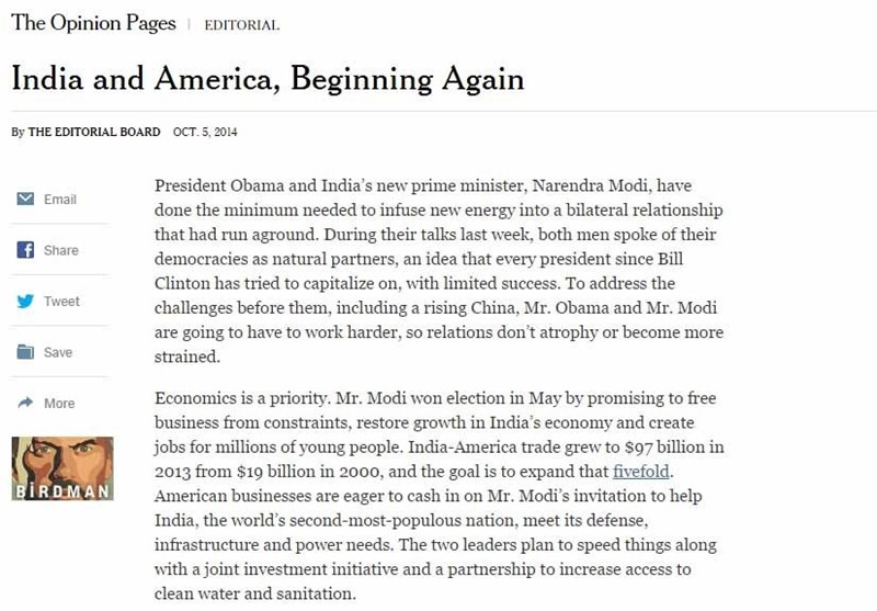 شورای سردبیری نشریه نیویورک تایمز نگاهی به روابط هند و آمریکا داشته است که خلاصه ای از آن در ادامه می آید: