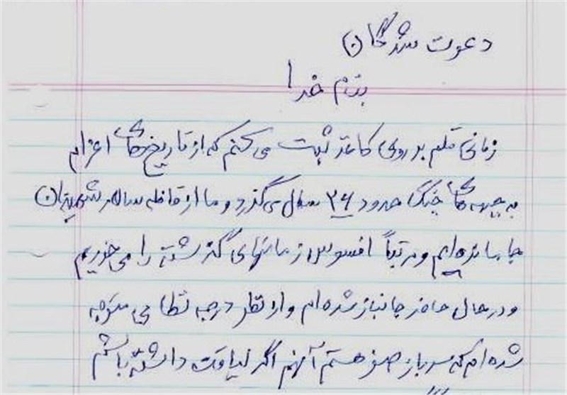 "زمانی قلم بر روی کاغذ ثبت میکند که از تاریخ اعزامهای به جبهه جنگ حدود 26 سال میگذرد و ما از قافله سالار شهیدان جا ماندهایم و مرتبا افسوس زمانهای گذشته را میخوریم در حال حاضر جانباز شدهام و از نظر درجه نظامی متوجه شدهام که سرباز صفر هستم آن هم اگر لیاقت داشته باشم..."