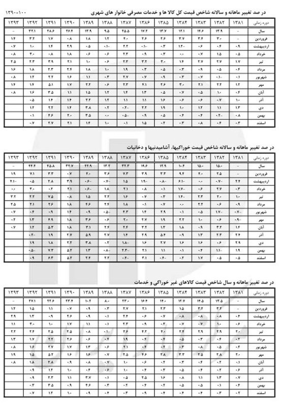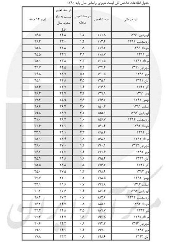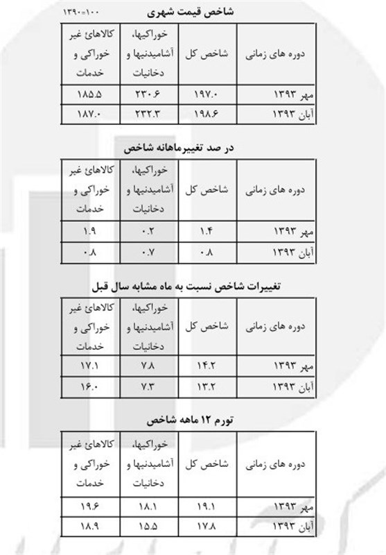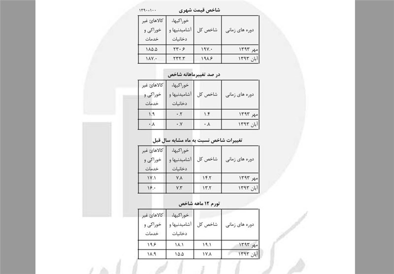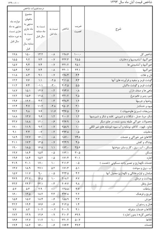 به گزارش خبرگزاری تسنیم، گزارش جدید مرکز آمار از شاخص قیمت کالاها و خدمات مصرفی خانوارهای شهری کشور در آبان ماه سال 1393 بر اساس سال پایه 1390 نشان میدهد: شاخص کل (بر مبنای 100= 1390) در آبان ماه سال 1393 عدد 198.6 را نشان میدهد که نسبت به ماه قبل 0.8 درصد افزایش داشته است. افزایش شاخص کل نسبت به ماه مشابه سال قبل (تورم نقطه به نقطه) 13.2 درصد میباشد که نسبت به همین اطلاع در ماه قبل (14.2) کاهش یافته است. درصد تغییرات شاخص کل (نرخ تورم شهری) در دوازده ماه منتهی به آبان ماه سال 93 نسبت به دوره مشابه سال قبل 17.8 درصد است که نسبت به همین اطلاع در مهر ماه 1393 (19.1) کاهش یافته است.