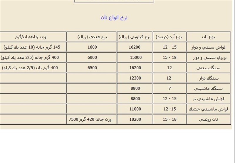 خبرگزاری تسنیم: مدیر عامل شرکت غله و خدمات بازرگانی منطقه 8 کشور قیمت‌های جدید انواع آرد و نان را در استان اعلام کرد و گفت: این قیمت‌ها از 11 آذر در استان قابل اجراست.
