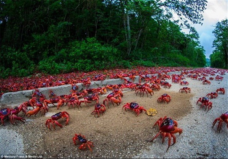 خرچنگ های قرمز در جزیره کریسمس درحال مهاجرت دسته جمعی از جنگل به سوی اقیانوس برای زاد و ولد سالیانه هستند. (Mercury)