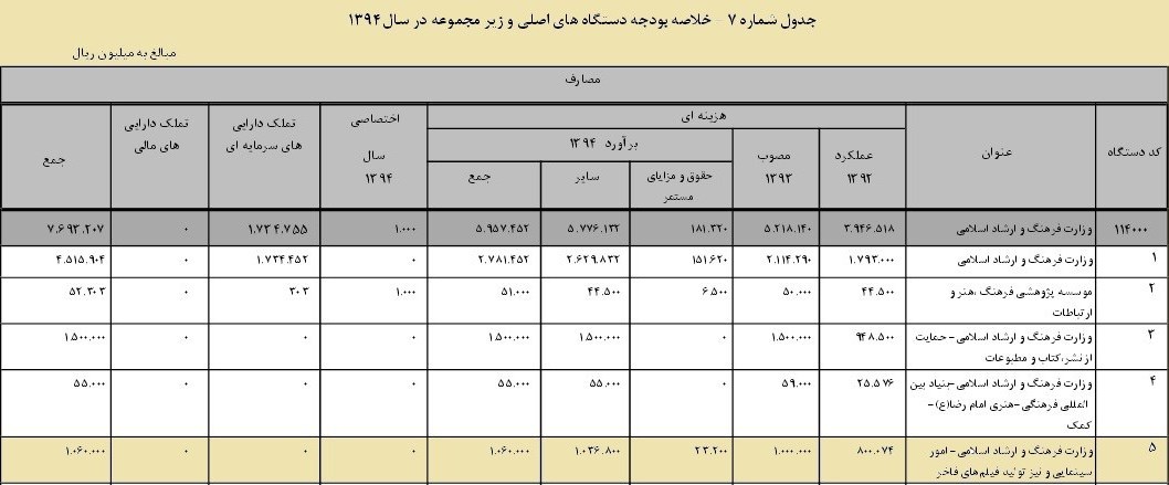 رقم پیشنهادی دولت برای بودجه وزارت فرهنگ و ارشاد اسلامی بیش از 769 میلیارد تومان است. این در حالی است که در بودجه پیشنهادی سال 93 بودجه این وزارتخانه 623 میلیارد تومان بوده است و این نشان از رشد نسبی بودجه وزارت ارشاد دارد.