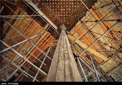 امیری افزود: مرحله سوم مرمت، شامل سقف ایوان بوده که با استفاده از هنر معرق تزئین شده و هزاران قطعه چوبی صورت گرفت اما متاسفانه در 50 سال گذشته به جای آنکه مرمت کنند، در آن از تخته استفاده کرده بودند و از آنجایی که چوب یکی ناپایدارترین عناصر بوده و گریز ناپذیر است، عمر مفید این چوبها از 400 سال به بعد به پایان میرسد. همزمان با مرمت ستون کففرش و سقف، مرمت ایوان نیز آغاز شد زیرا سقف بیش از 60 سال است که مرمت نشده بود.