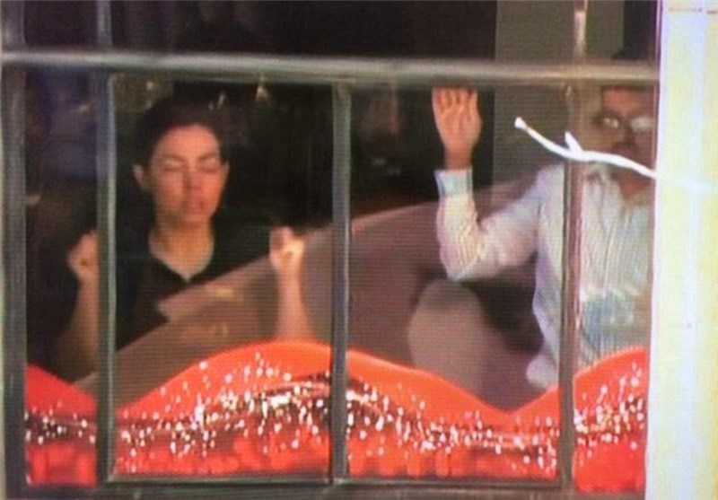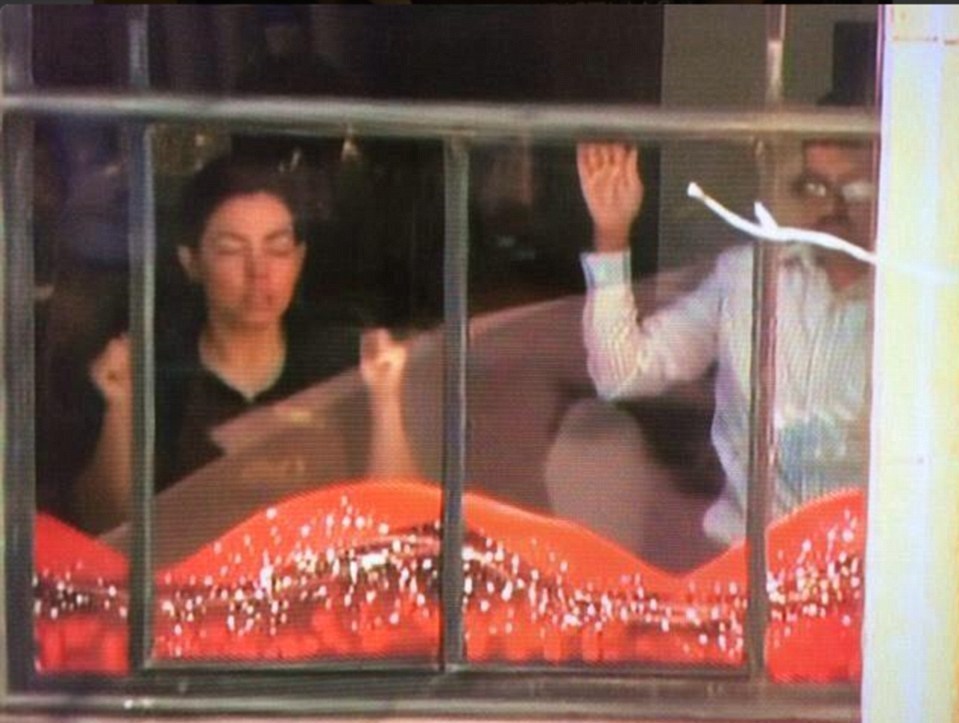 دو نفر از گروگانها دستهای خود را روی شیشههای کافه رستوران گذاشتهاند