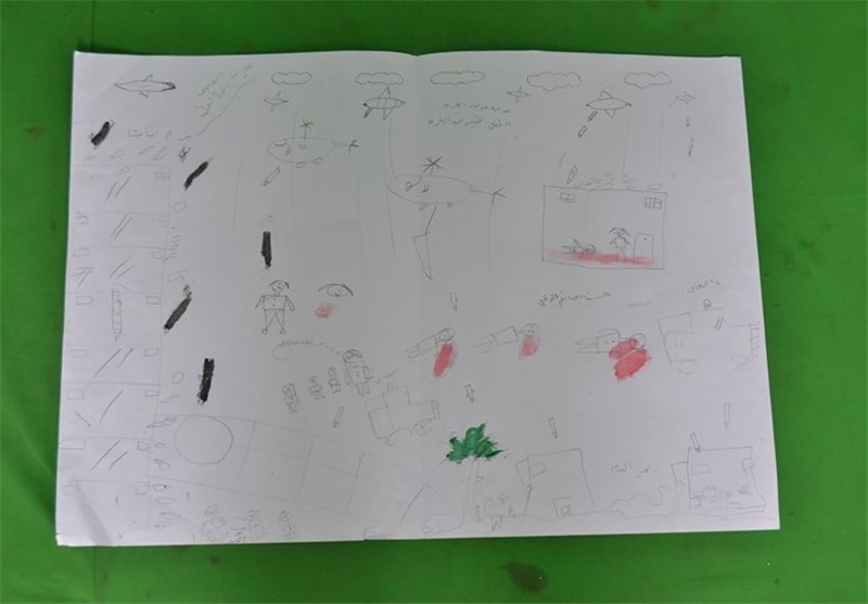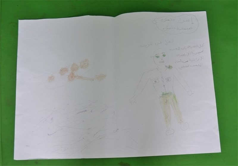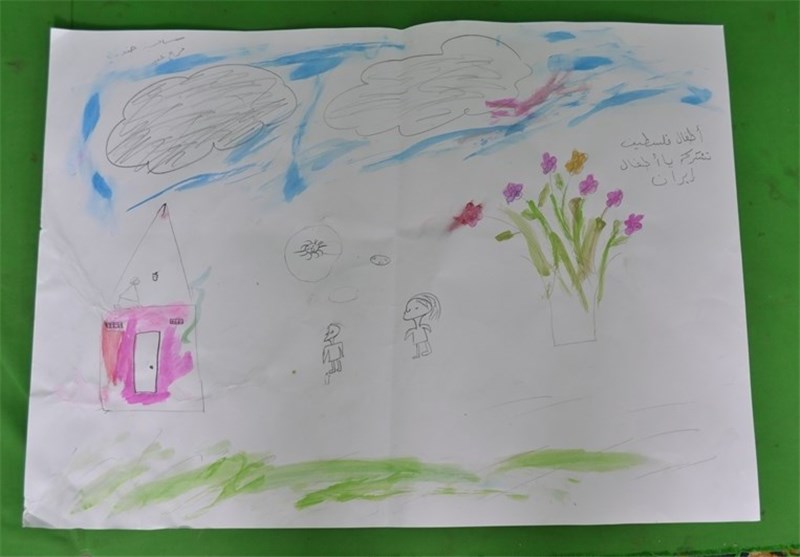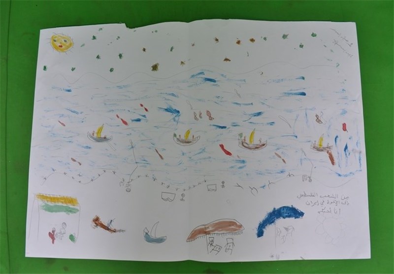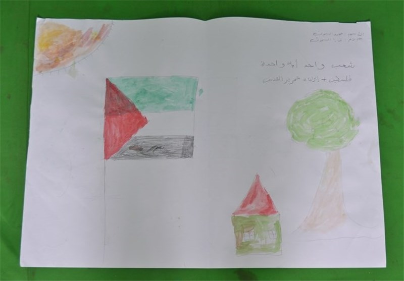 روی نقاشی کودکان جملاتی نظیر «ایران+ فلسطین= آزادی قدس»، «ملت واحد؛ امت واحده»، «درود فراوان به ملت جمهوری اسلامی ایران از طرف فرزندان ملت فلسطین»، «از ملت فلسطین به برادرانمان در ایران: من دوستتان دارم» و... به چشم میخورد.