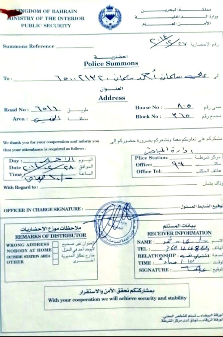تصویر احضاریه برای شیخ علی سلمان را در زیر ملاحظه میکنید.
