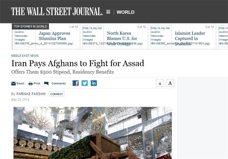 روزنامه آمریکایی وال استریت ژورنال، 22 می 2014 در گزارشی بهزعم خود از استخدام افغانها در ایران برای جنگ در سوریه پرده برداشت.