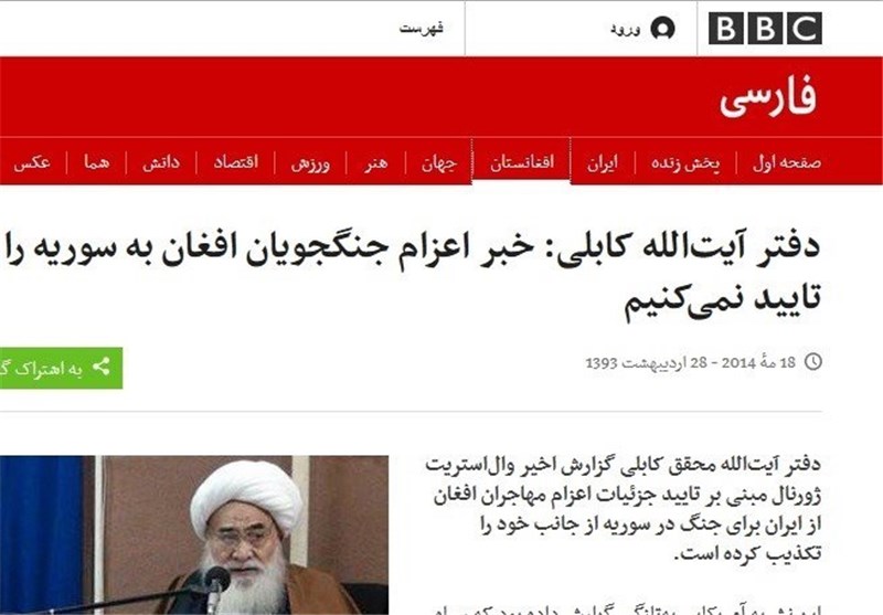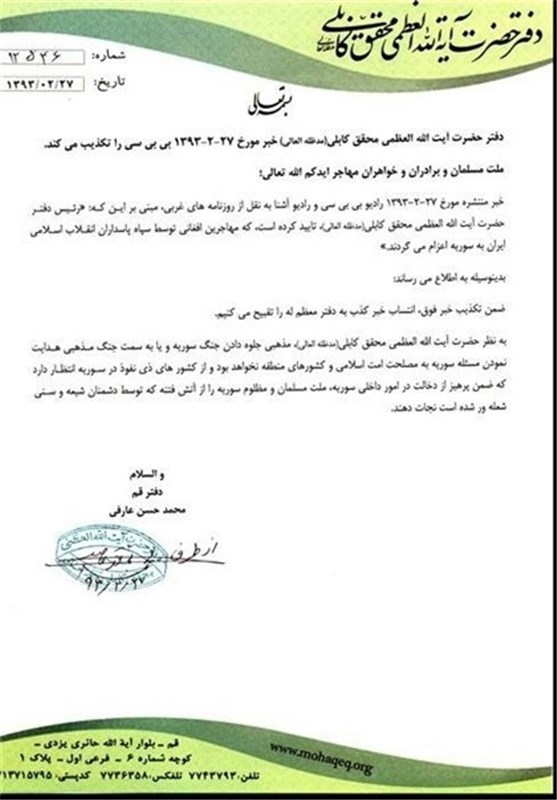 «ملت مسلمان و برادران و خواهران مهاجر، ایدکم الله تعالی؛ خبر منتشره مورخ 27-2-1393 رادیو بیبیسی و رادیو آشنا به نقل از روزنامههای غربی، مبنی بر اینکه: «رئیس دفتر حضرت آیت الله العظمی محقق کابلی (مد ظله العالی)، تأیید کرده است، که مهاجرین افغانی توسط سپاه پاسداران انقلاب اسلامی ایران به سوریه اعزام میگردند»