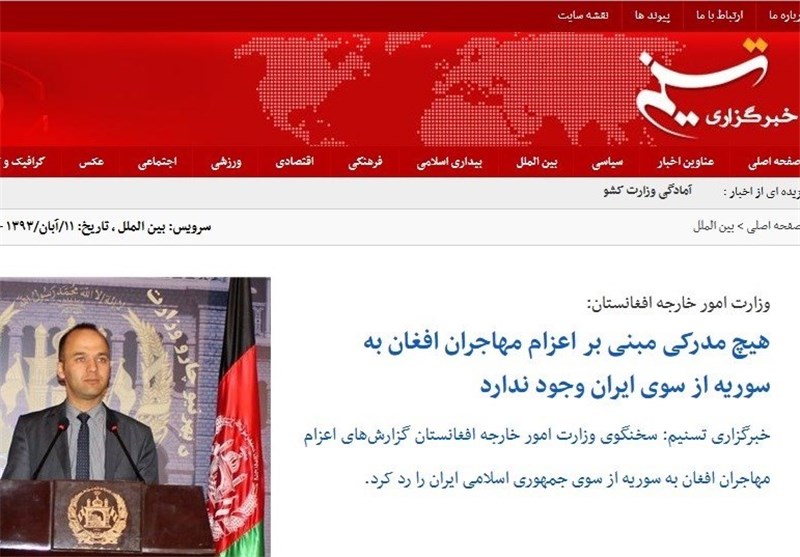 «شکیب مستغنی» سخنگوی وزارت امور خارجه افغانستان در نشستهای متعدد خبری خود در پاسخ به خبرنگاران همواره اعزام مهاجران افغانستانی مقیم ایران به سوریه توسط جمهوری اسلامی ایران را رد کرد تا این موضوع از طریق مقامات رسمی کشور اسلامی افغانستان نیز تکذیب شود.