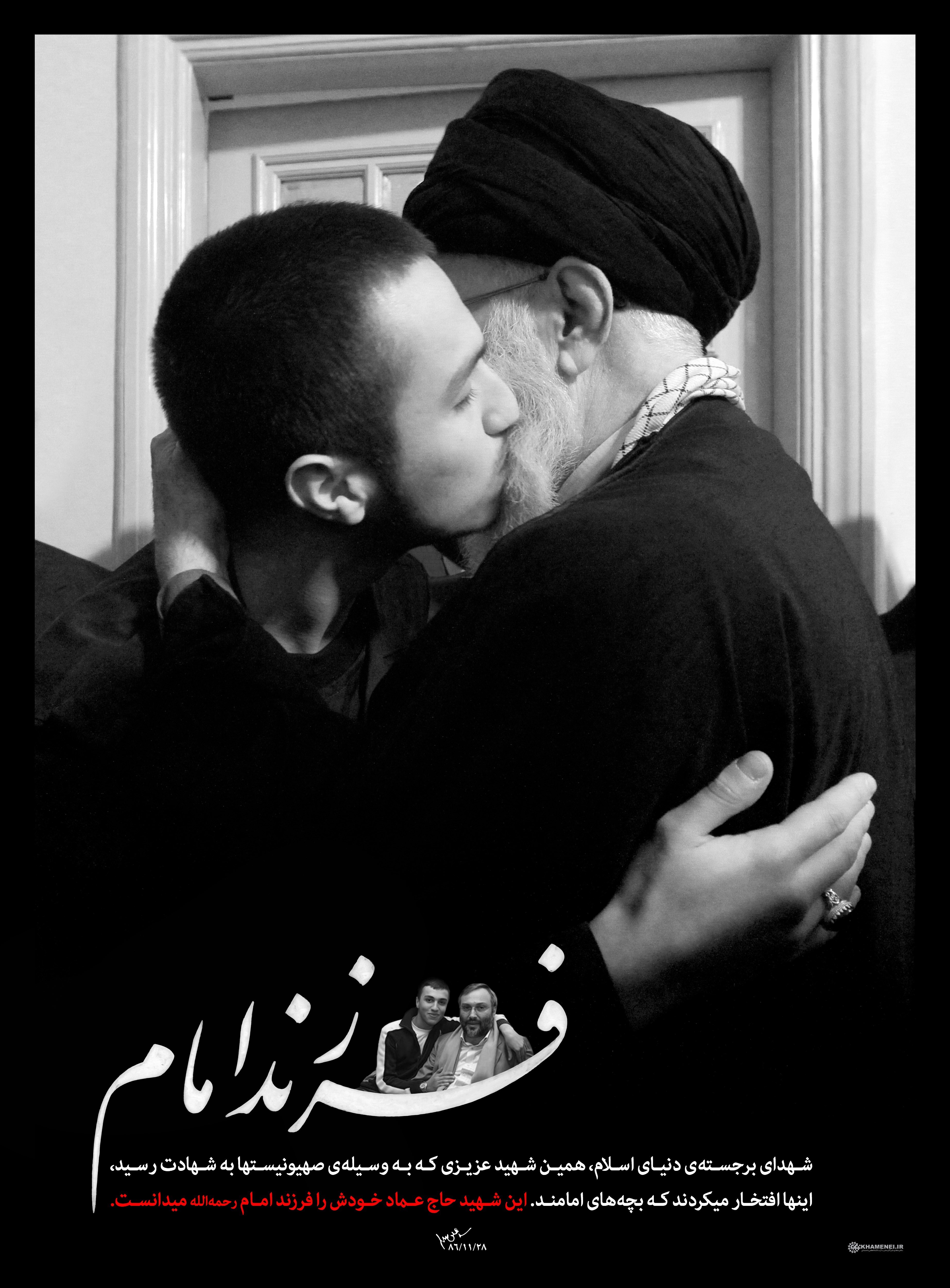 جمله ای که در ذیل این تصاویر به نقل از رهبر معظم انقلاب آورده شده عبارتند از:«همین شهدای برجستهی دنیای اسلام، همین شهید عزیزی که به وسیلهی صهیونیستها به شهادت رسید، اینها افتخار میکردند که بچههای امامند؛ خودشان را فرزند امام میدانستند. این شهید حاج عماد خودش را فرزند امام میدانست. 1386/11/28»