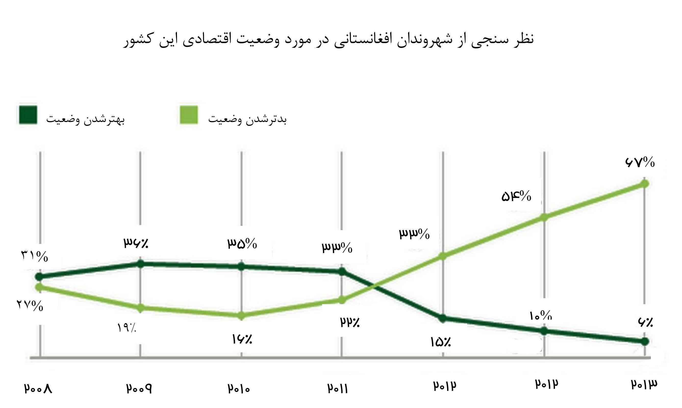 این نظرسنجی که با عنوان «نگاه افغان‌ها به اقتصادشان» منتشر شده، نشان می‌دهد از هر سه شهروند افغانستان، دو نفر آن‌ها بر این باورند که شرایط اقتصادی در کشورشان رو به وخامت است.