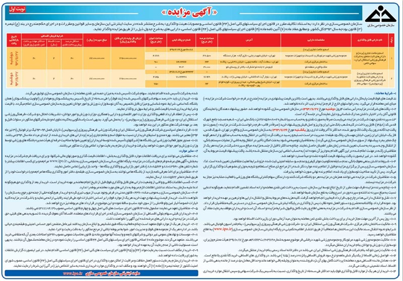 به گزارش خبرنگار اقتصادی خبرگزاری تسنیم؛ سازمان خصوصیسازی بهاستناد تکالیف مقرر در قانون اجرای سیاستهای کلی اصل 44 قانون اساسی، مصوبات هیئت واگذاری، سایر قوانین و مقررات و در اجرای حکم مندرج در بند (ع) تبصره (3) قانون بودجه سال 1393 کل کشور و نیز مطابق مفاد ماده (6) آئیننامه ماده (19) قانون اجرای سیاستهای کلی اصل 44 اقدام به برگزاری مزایده واگذاری دو تیم استقلال و پرسپولیس در روز دوشنبه 27 بهمن خواهد کرد.، داراییهای بهشرح جدول ذیل را از طریق مزایده واگذار نماید.