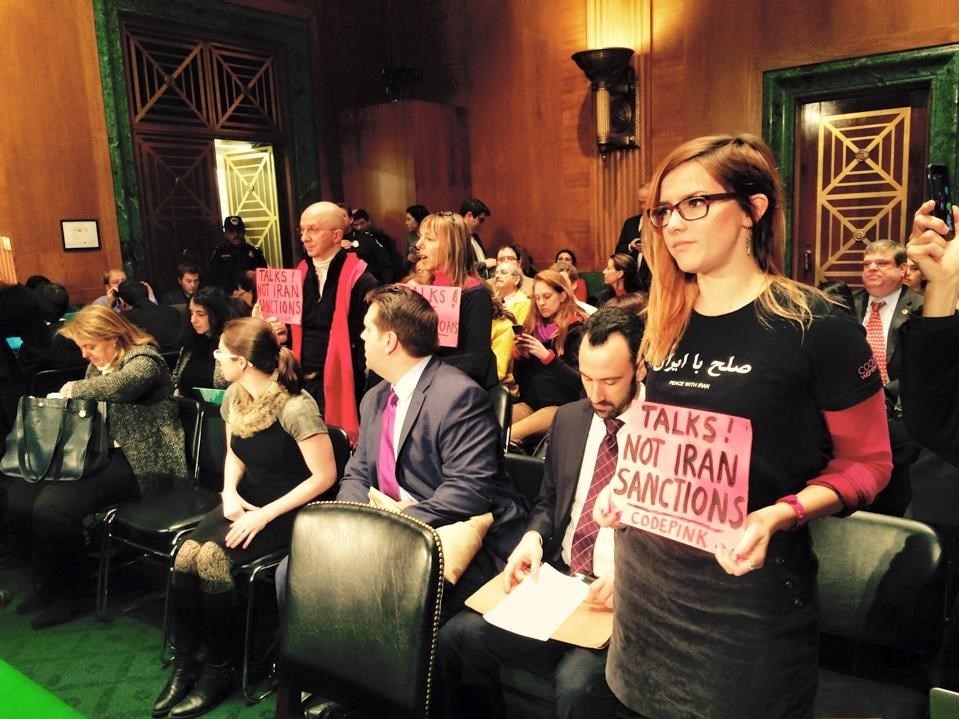 در این نشست استماع، چند تن از برجستهترین اعضای سازمان ضدجنگ و هوادار صلح "کدپینک" از جمله مدیا بنجامین، سرگئی کاستین و آنا کامینسکی طی برگزاری این اعتراض با سردادن شعارهایی مبنی بر "گفتگو کنید، ایران را تحریم نکنید" نسبت به رویکرد غالب اعضای این کمیته در قبال ایران و تلاش برای اعمال تحریمهایی علیه تهران اعتراض کردند.