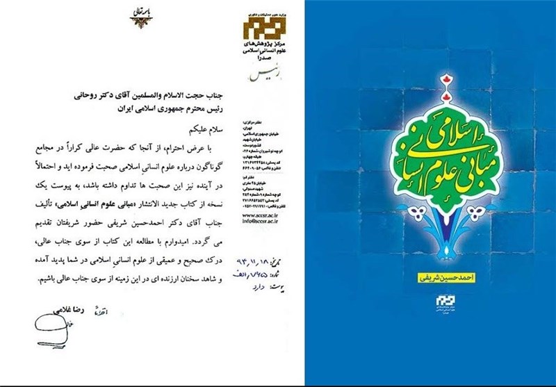 با عرض احترام، از آنجا که حضرت عالی کراراً در مجامع گوناگون درباره علوم انسانی اسلامی صحبت فرموده اید و احتمالاً در آینده نیز این صحبت ها تداوم داشته باشد، به پیوست یک نسخه از کتاب جدید الانتشار «مبانی علوم انسانی اسلامی» تألیف جناب آقای دکتر احمد حسین شریفی حضور شریفتان تقدیم می گردد.