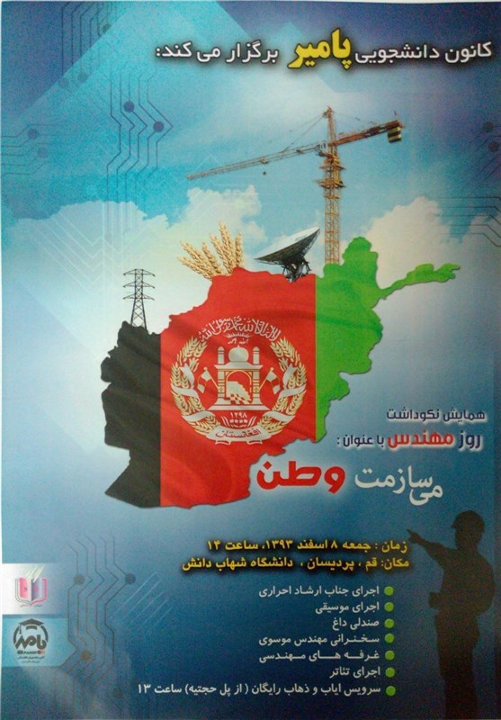 مراسم نکوداشت روز مهندسی با عنوان "می سازمت وطن" و با هدف ایجاد انگیزه و توجه بیشتر نسل جوانان محصل افغانستانی به ضرورت گسترش رشته های فنی مهندسی جهت رفع نیازهای داخلی، برگزار میشود. این همایش در روز جمعه هشتم اسفندماه در این مکان برگزار میشود: قم. پردیسان. بلوار امامت. دانشگاه شهاب دانش. سالن اجتماعات