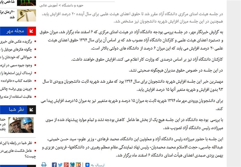 روز گذشته پایگاه اطلاعرسانی دانشگاه آزاد مصوبات جلسه هیئتامنای این دانشگاه را با تیتر "روز خوب دانشگاه آزاد اسلامی در هیئتامنای مرکزی/ تصویب همه پیشنهادها بهاتفاق آراء" منتشر کرد، اما اشارهای به افزایش شهریههای دانشگاه آزاد نداشت.