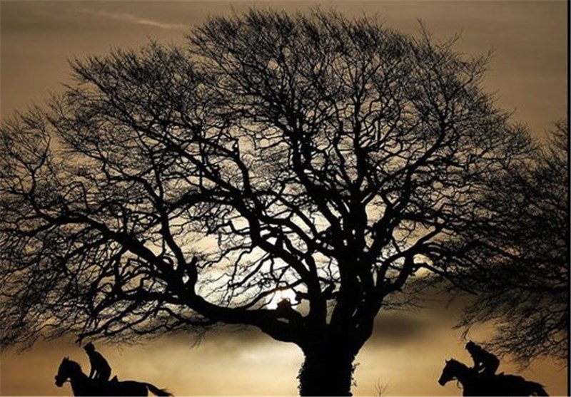 سوارکاران در طلوع زیبای خورشید در حومه روستای «لمبورن» انگلیس