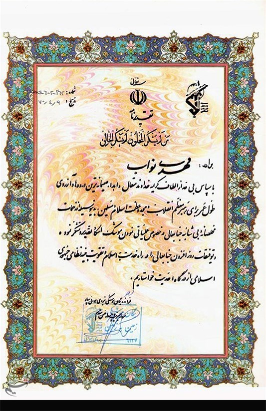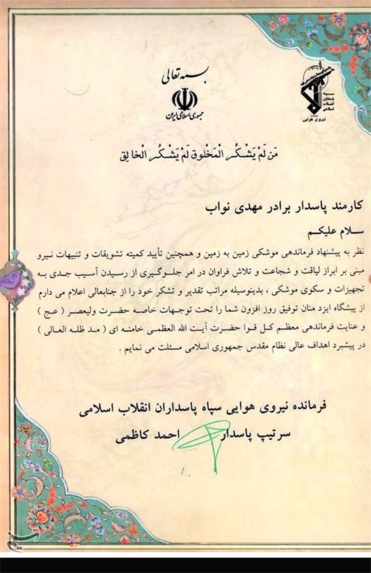 تقدیر سردار شهید احمد کاظمی فرمانده نیروی هوایی سپاه پاسداران از شهید نواب به خاطر جلوگیری از رسیدن آسیب جدی به تجهیزات و سکوی موشکی
