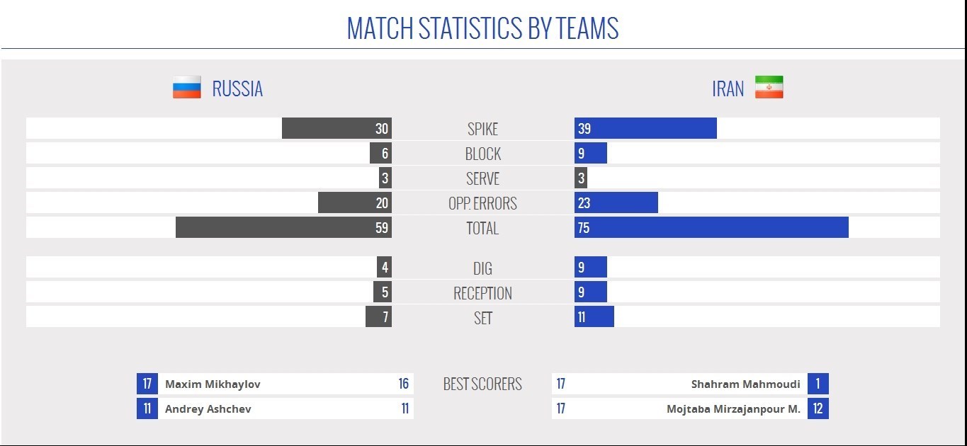 در این مسابقه همچنین بازیکنان تیم ایران 23 امتیاز از اشتباهات تیم ملی روسیه به دست آوردند و در مقابل 20 امتیاز نیز از اشتباهات خود به حریف تقدیم کردند.