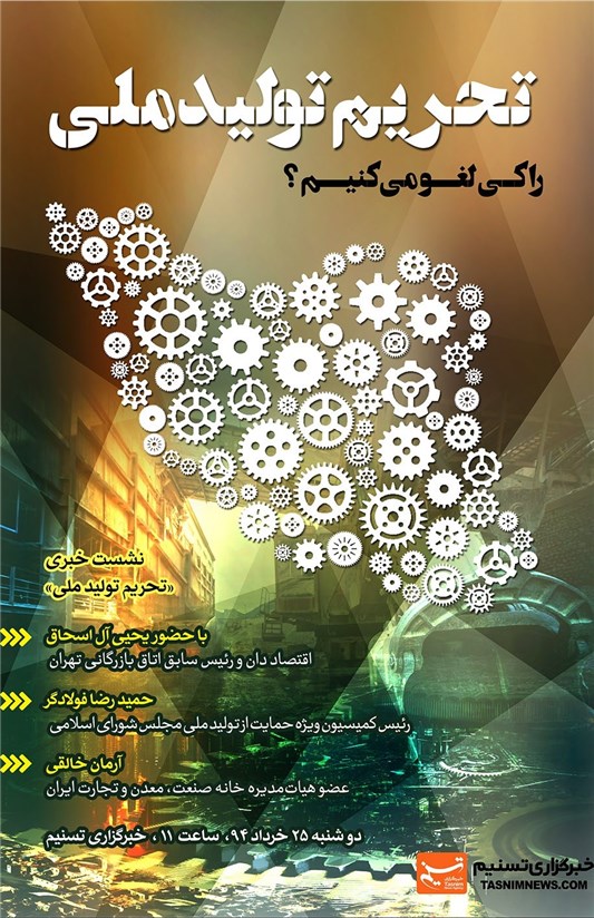 خبرگزاری تسنیم در این راستا امروز نشستی با شعار «تحریم تولید ملی را کی لغو میکنیم؟» با حضور یحیی آلاسحاق اقتصاددان، رئیس سابق اتاق بازرگانی و وزیر اسبق بازرگانی، حمیدرضا فولادگر رئیس کمیسیون ویژه تولید ملی مجلس شورای اسلامی، آرمان خالقی عضو هیئت مدیره خانه صنعت و معدن و عضو سابق کمیته حمایت از تولید ملی و اصحاب رسانه برگزار میکند.