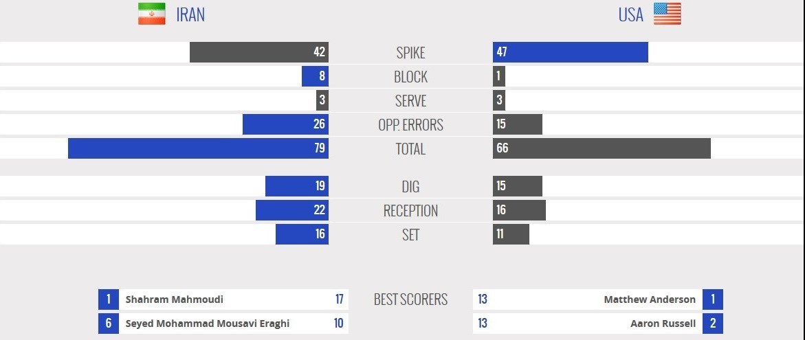 در این مسابقه همچنین بازیکنان تیم ایران 16 امتیاز از اشتباهات تیم ملی آمریکا به دست آوردند و در مقابل 11 امتیاز نیز از اشتباهات خود به حریف تقدیم کردند.