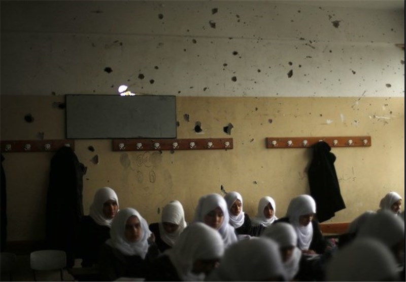 دانش آموزان دختر فلسطینی در حال مطالعه در کلاسی که آثار حمله اسرائیل بر دیوارهای آن نمایان است
