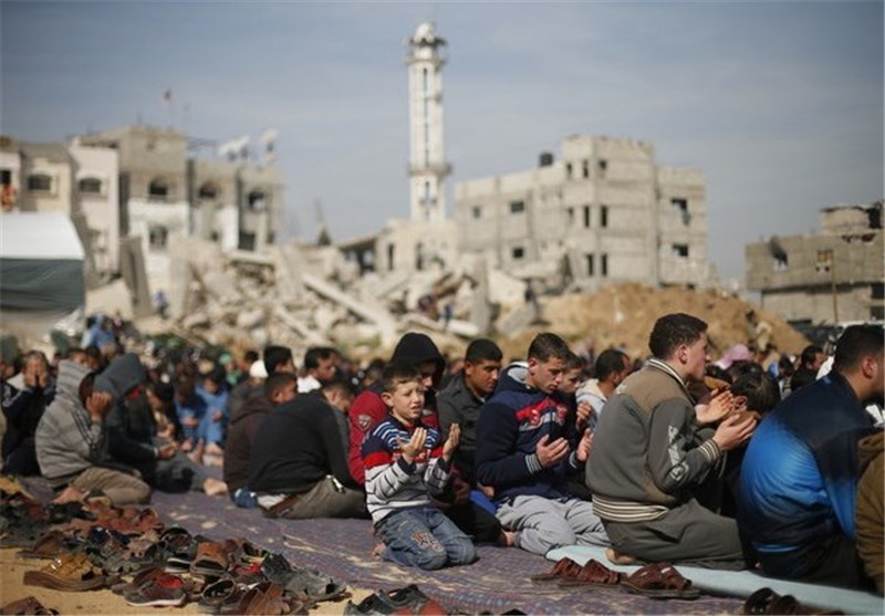ادای نماز جماعت در کنار ویرانههای به جا مانده از حملات جنگندههای رژیم صهیونیستی