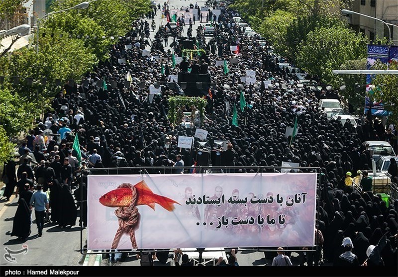 * بعد از زیارت عاشورا طنین «لا اله الا الله» میدان فلسطین را فراگرفت و تابوت شهدا از مسجد امام صادق(ع) به میان جمعیت تشییع کننده آمد. گروه موتور سواران با پرچمهای سیاهرنگ و منقش به اذکار اهل بیت(ع) پیش روی جمعیت تشییع کننده مسیر را برای عبور مردم بهشکلی منظم و هماهنگ آماده میکرد. این موتورسواران تا پایان مسیر تشییع جلوی انبوه جمعیت حرکت میکردند.
