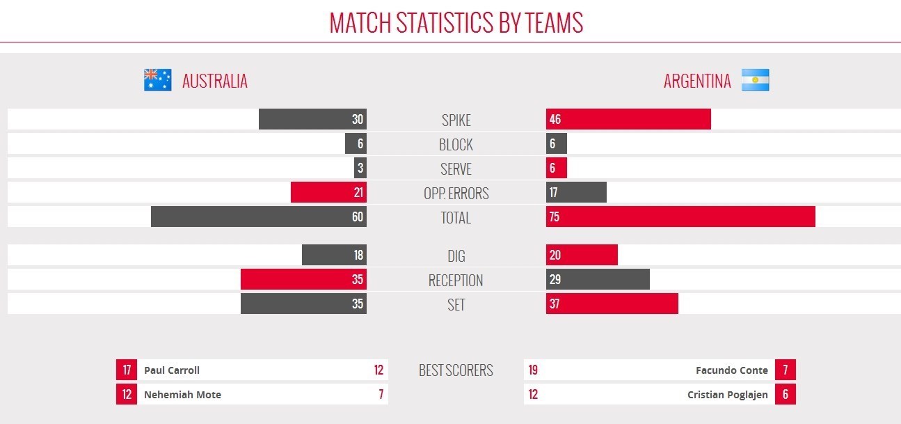 در پایان این دیدار فاکوندو کونته 19 امتیاز برای آرژانتین و پل کارول 12 امتیاز برای استرالیا کسب کردند. آرژانتین فردا در بازی بعدی خود به مصاف کانادا میرود و استرالیا باید با لهستان روبهرو شود.
