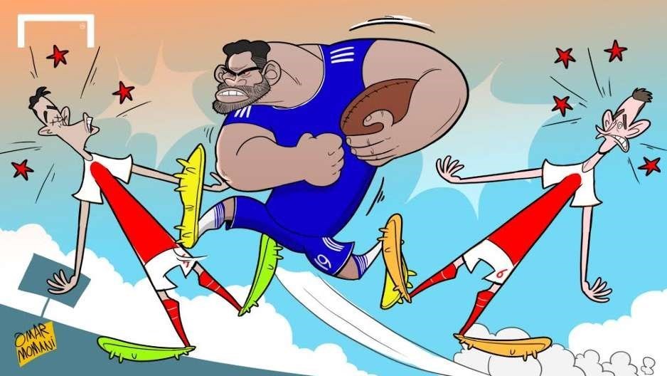 در حالی که مسابقات جام جهانی راگبی در انگلیس در حال برگزاری است، عمر مؤمنی، کاریکاتوریست نسخه بینالمللی سایت «گل» بازی خشن دیهگو کاستا را سوژه خود کرده و معتقد است که این مهاجم اسپانیایی با مهارتهایی که روز گذشته برای از پیشرو برداشتن کاسلینی و گابریل از خود نشان داد، میتوانست در جام جهانی راگبی حضور پیدا کند.