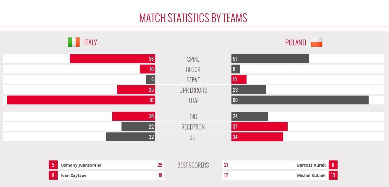 بازیکنان ایتالیا در ستهای اول، سوم و چهارم با نتایج 26 بر 24، 25 بر 22 و 25 بر 19 لهستان را مغلوب کردند و فقط در ست دوم 22 بر 25 شکست خوردند.