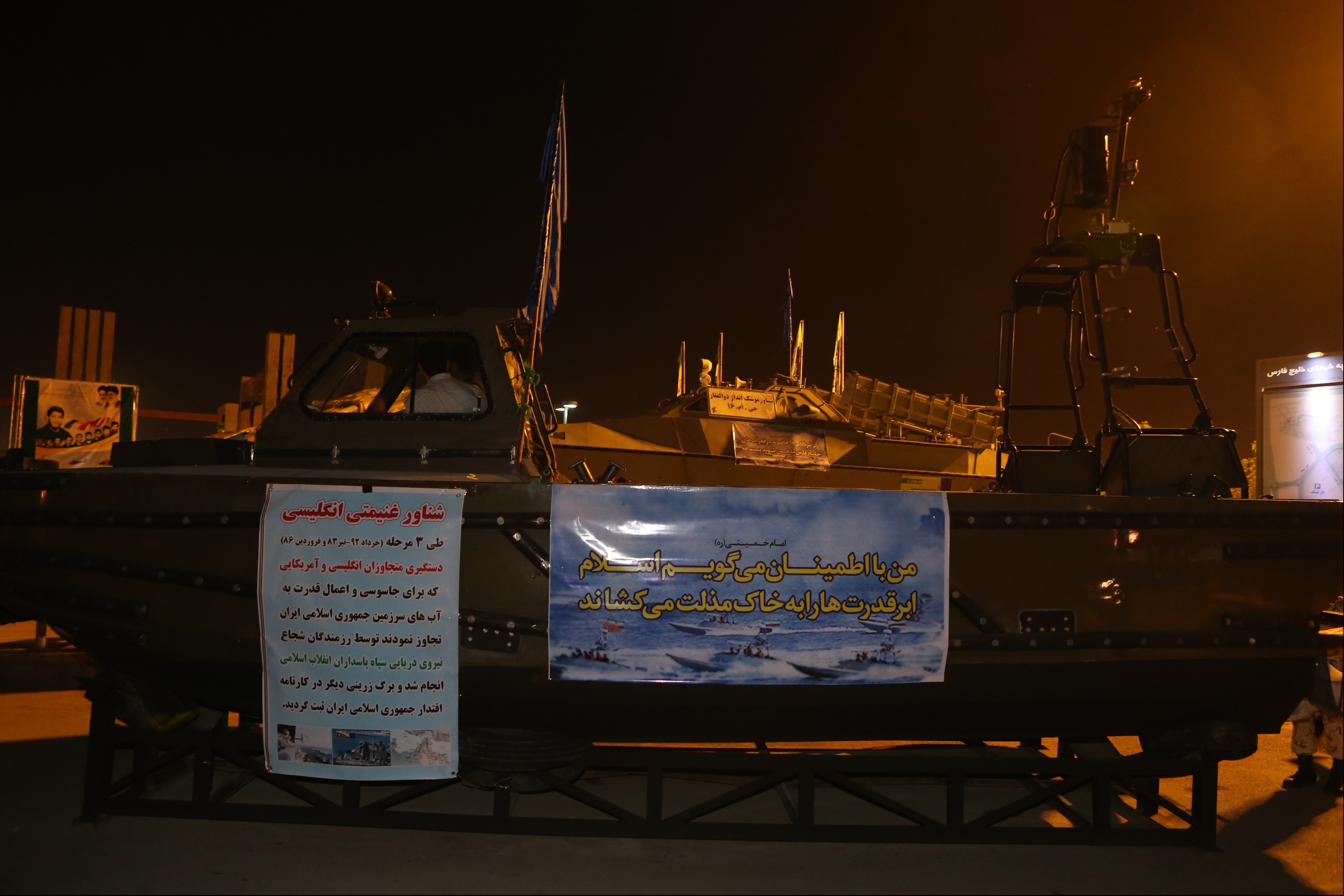 به گزارش خبرنگار دفاعی خبرگزاری تسنیم، قایق توقیف شده متعلق به نظامیان انگلیسی که در تعطیلات نوروزی سال 86 توسط نیروی دریایی سپاه پاسداران در آبهای نیلگون اروندرود توقیف شده بود از شب گذشته در حاشیه دریاچه خلیج فارس در تهران، در معرض دید عموم قرار گرفته است.