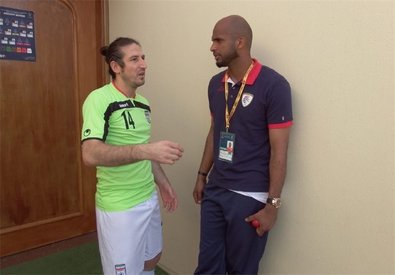* آندرانیک تیموریان و علی الحبسی قبل از آغاز تمرین پیش از بازی با یکدیگر صحبت کردند. این دو در تیم فوتبال بولتون با یکدیگر همتیمی بودند.