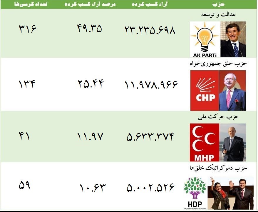 شمارش بیش از 97 درصد آراء انتخابات پارلمانی ترکیه نشان می‌دهد حزب عدالت و توسعه می‌تواند به تنهایی و بدون نیاز به سایر احزاب بار دیگر دولت این کشور را تشکیل دهد.
