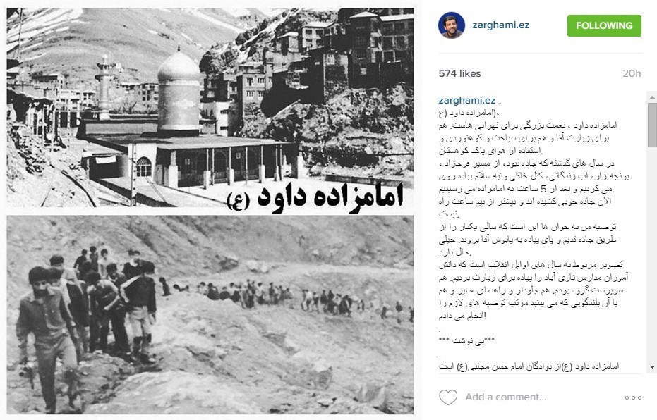 به گزارش گروه رسانه های خبرگزاری تسنیم ؛ عزت الله ضرغامی در صفحه اینستاگرام خود نوشت :امامزاده داود ، نعمت بزرگی برای تهرانی هاست. هم برای زیارت آقا و هم برای سیاحت و کوهنوردی و استفاده از هوای پاک کوهستان.در سال های گذشته که جاده نبود، از مسیر فرحزاد ، یونجه زار، آب زندگانی، کتل خاکی وتپه سلام پیاده روی می کردیم و بعد از 5 ساعت به امامزاده می رسیدیم.الان جاده خوبی کشیده اند و بیشتر از نیم ساعت راه نیست.توصیه من به جوان ها این است که سالی یکبار را از طریق جاده قدیم و پای پیاده به پابوس آقا بروند. خیلی حال دارد.