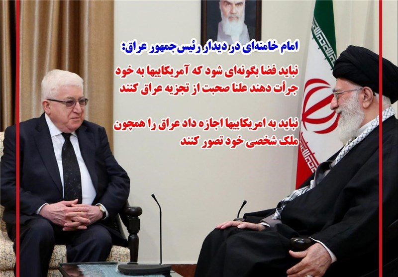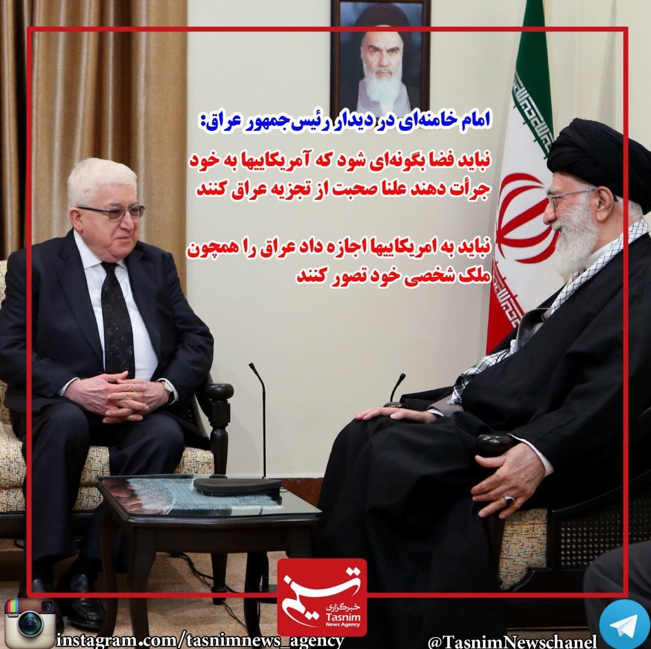 رهبر معظم انقلاب تأکید کردند: نباید فضا به‌گونه‌ای شود که آمریکایی‌ها به خود جرأت دهند تا به‌‌صورت علنی صحبت از تجزیه عراق کنند.