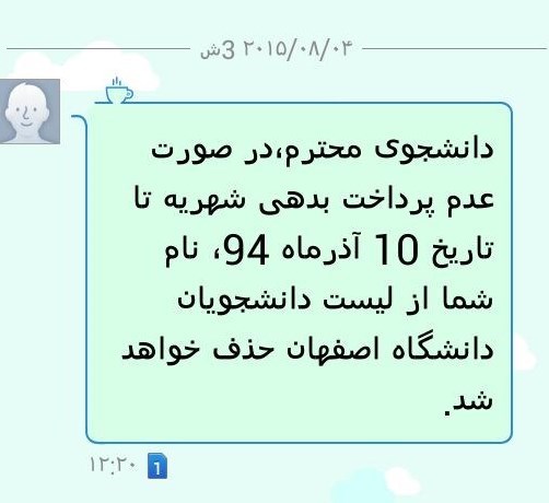 در متن این پیامک که برای دانشجویان بورسیه دانشگاه اصفهان صادر شده آمده است: "دانشجوی محترم، درصورت عدم پرداخت بدهی شهریه تا تاریخ 10 آذرماه 94، نام شما از لیست دانشجویان دانشگاه اصفهان حذف خواهد شد."