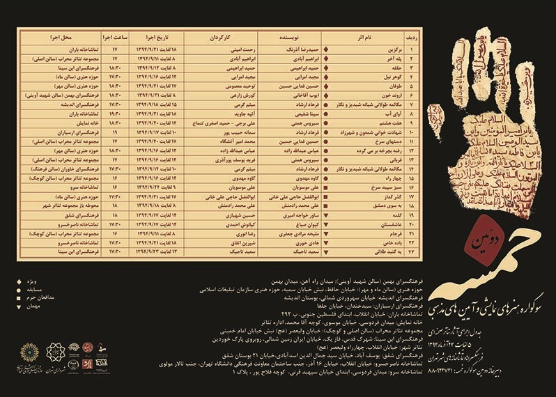 دومین سوگواره هنرهای نمایشی و آیینهای مذهبی خمسه با حمایت سازمان فرهنگی هنری شهرداری تهران و به دبیری علیاصغر خسروی از هشتم الی 25 آذر ماه در تهران برپا میشود.