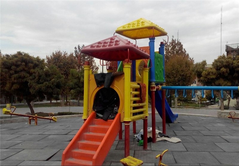 نمایی از پارکی که محل عبور دانشآموزان است و وسایل معتادان بر روی وسایل بازی پارک قرار دارد