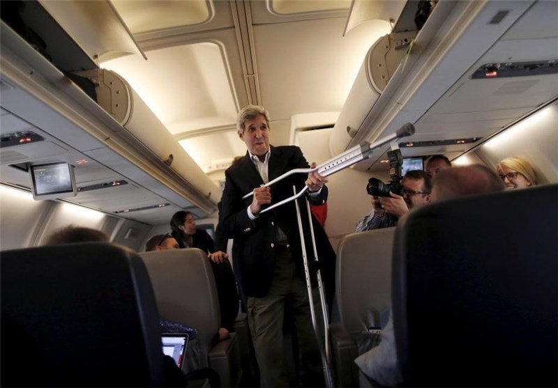 جان کری، وزیر خارجه آمریکا، در هواپیما عازم مذاکرات هسته‌ای وین