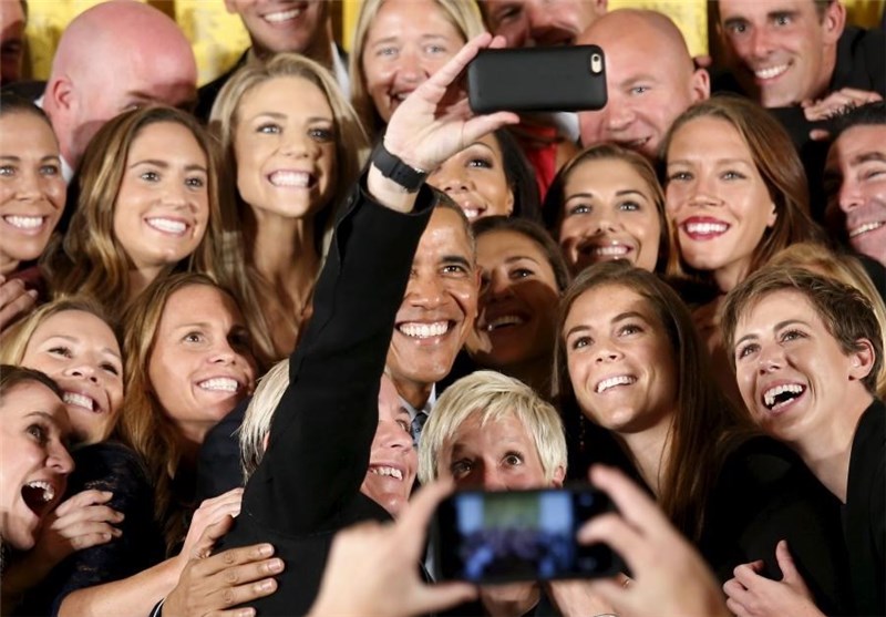 باراک اوباما، در حال گرفتن عکس سلفی با اعضای تیم ملی فوتبال زنان آمریکا