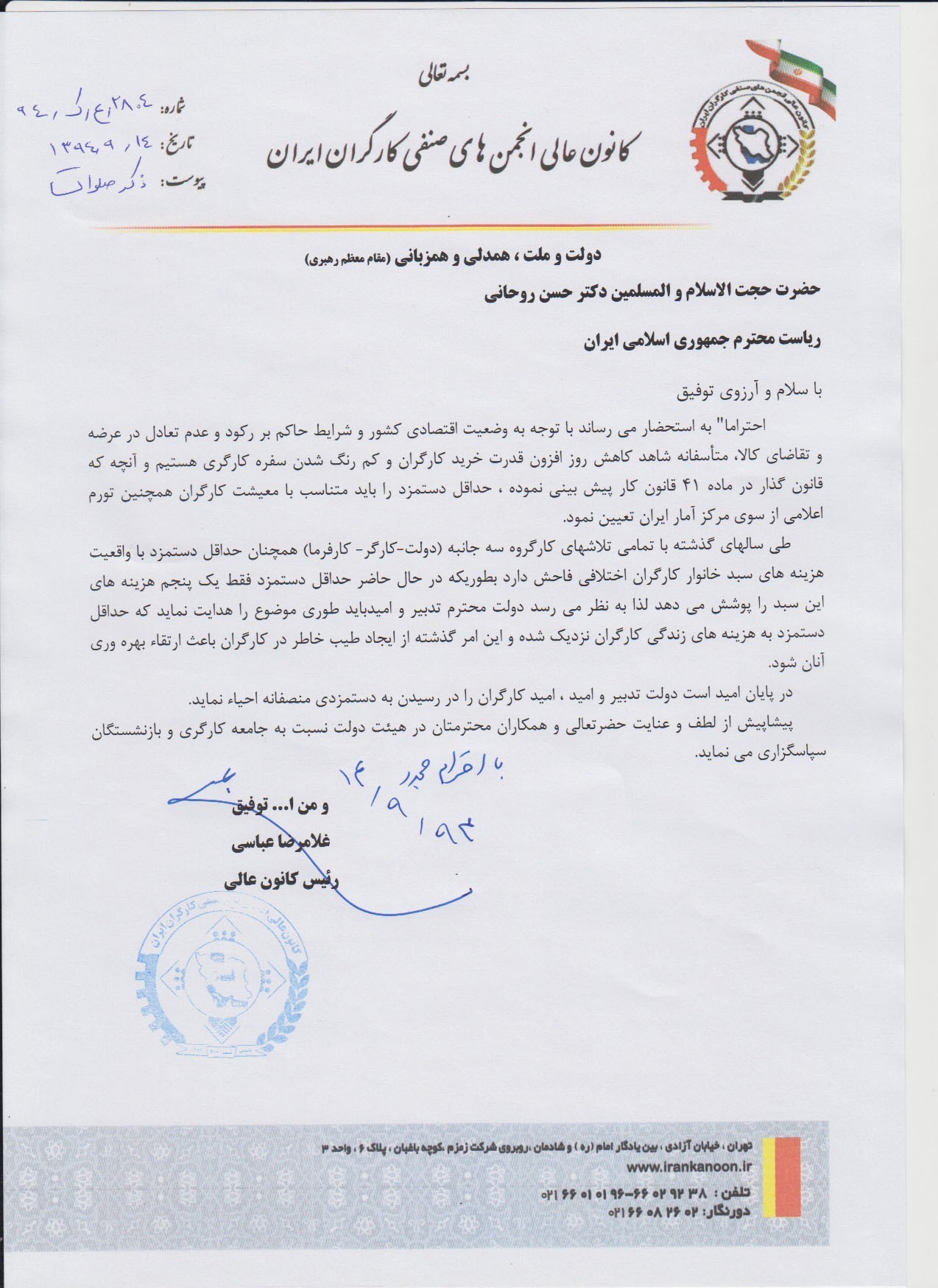 احتراماً به استحضار میرساند با توجه به وضعیت اقتصادی کشور و شرایط حاکم بر رکود و عدم تعادل در عرضه و تقاضای کالا، متأسفانه شاهد کاهش روز افزون قدرت خرید کارگران و کم رنگ شدن سفره کارگری هستیم و آنچه که قانون گذار در ماده 41 قانون کار پیشبینی نموده، حداقل دستمزد را باید متناسب با معیشت کارگران همچنین تورم اعلامی از سوی مرکز آمار ایران تعیین نمود.