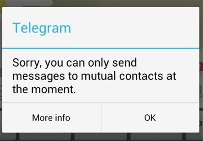 به گزارش خبرنگار فناوری اطلاعات و ارتباطات خبرگزاری تسنیم، ممکن است برخی کاربران تلگرام در هنگام ارسال پیام به افراد دیگر با پیام "Sorry, you can only send messages to mutual contacts at the moment" مواجه شوند و پیامشان ارسال نگردد.